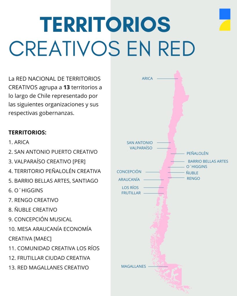 Esto, en torno a cuatros ejes principales: fortalecimiento de ecosistemas creativos; incidencia en política pública; vinculación y articulación de ecosistemas creativo; y divulgación; los que se desarrollan en los territorios creativos: Arica, San Antonio Puerto Creativo, Valparaíso Creativo, Territorio Peñalolén Creativa, Barrio Bellas Artes, O’Higgins, Rengo Creativo, Ñuble Creativo, Concepción Musical, Comunidad Creativa Los Ríos, Mesa Araucanía Economía Creativa, Frutillar Ciudad Creativa de la Música, Magallanes Creativo.
