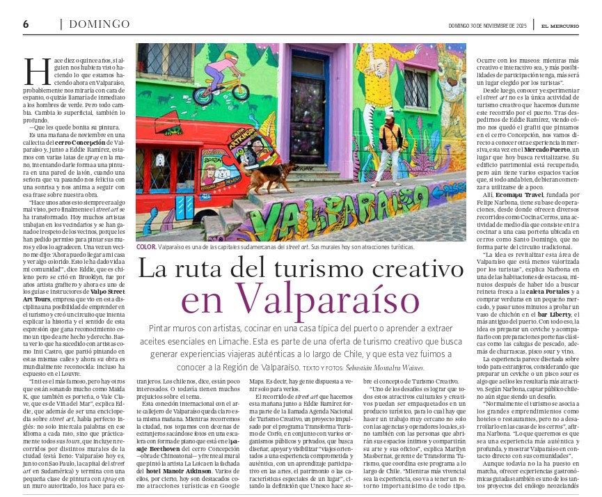 Este domingo 30 de noviembre la Revista Domingo de El Mercurio destacó el trabajo que busca fortalecer el turismo creativo en Valparaíso y distintos destinos del país.