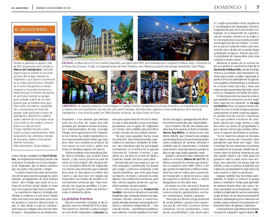 El Mercurio lo destaca así: «¿El turismo que viene? Una serie de novedosas experiencias viajeras —desde pintar murales junto a artistas de street art en los cerros de Valparaíso, hasta aprender a extraer aceites esenciales en una granja aromática de Limache— forman parte de la Agenda Nacional de Turismo Creativo, un proyecto impulsado por Corfo para diversificar la oferta turística en distintas ciudades de Chile y que en la Región de Valparaíso ya tiene varios proyectos funcionando». Revisa el reportaje completo en Revista Domingo – El Mercurio.