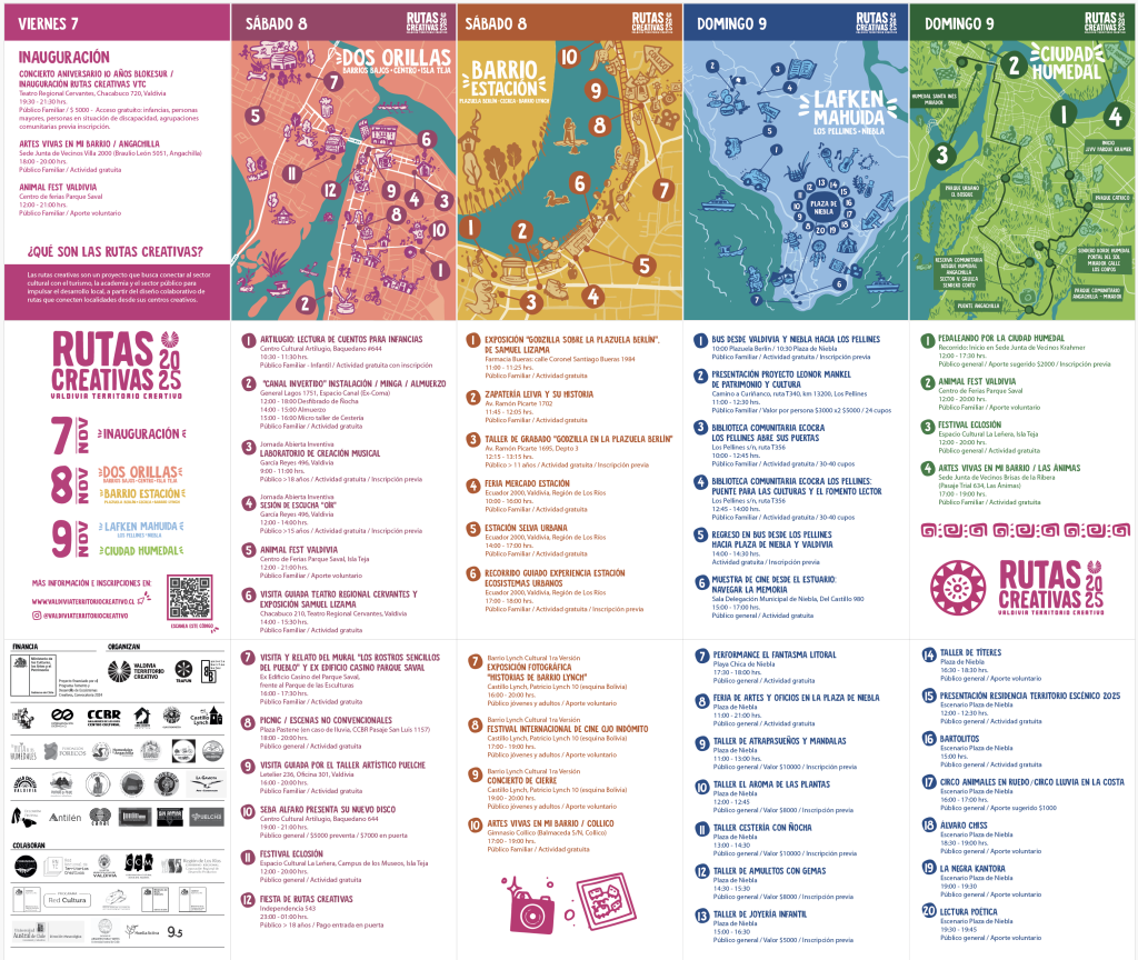 A partir de hoy, está disponible el sitio web www.valdiviaterritoriocreativo.cl, donde se pueden conocer todos los detalles de la programación, las zonas que conforman las Rutas Creativas y las actividades que se desarrollarán durante el 7, 8 y 9 de noviembre. El sitio reúne información sobre los recorridos, artistas y espacios participantes, además de ofrecer orientaciones para el público que desee sumarse a esta experiencia que invita a descubrir la ciudad desde la creación y la colaboración.