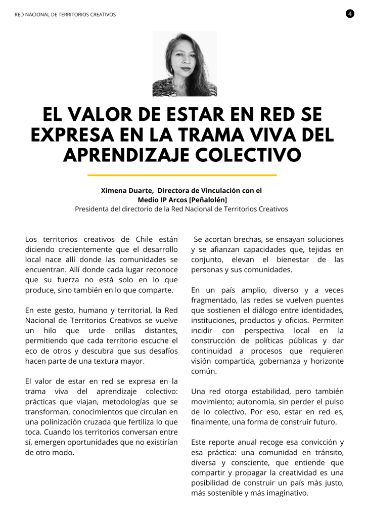 En esta carta publicada en el reporte anual de la Red Nacional de Territorios Creativos, la presidenta del directorio de la red y Directora de Vinculación con el Medio IP Arcos (Peñalolén), Ximena Duarte, aborda las oportunidades que se abren cuando los territorios se conectan.