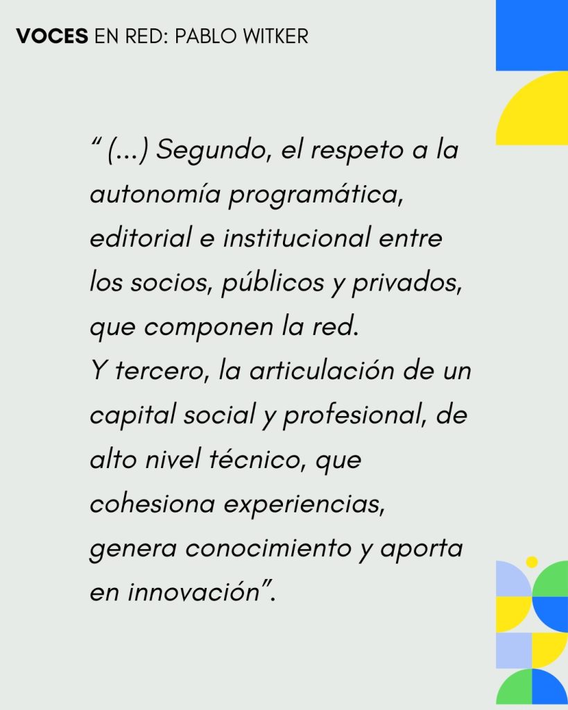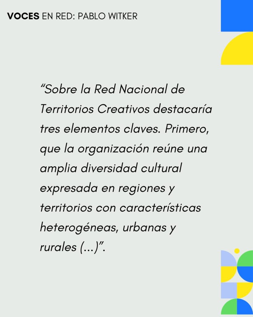 “Sobre la Red Nacional de Territorios Creativos destacaría tres elementos claves. Primero, que la organización reúne una amplia diversidad cultural expresada en regiones y territorios con características heterogéneas, urbanas y rurales. Segundo, el respeto a la autonomía programática, editorial e institucional entre los socios, públicos y privados, que componen la red. Y tercero, la articulación de un capital social y profesional, de alto nivel técnico, que cohesiona experiencias, genera conocimiento y aporta en innovación. Y, lo mejor de todo, es que las dinámicas creativas se encuentran en franca expansión, tanto en Chile y como en el mundo”.