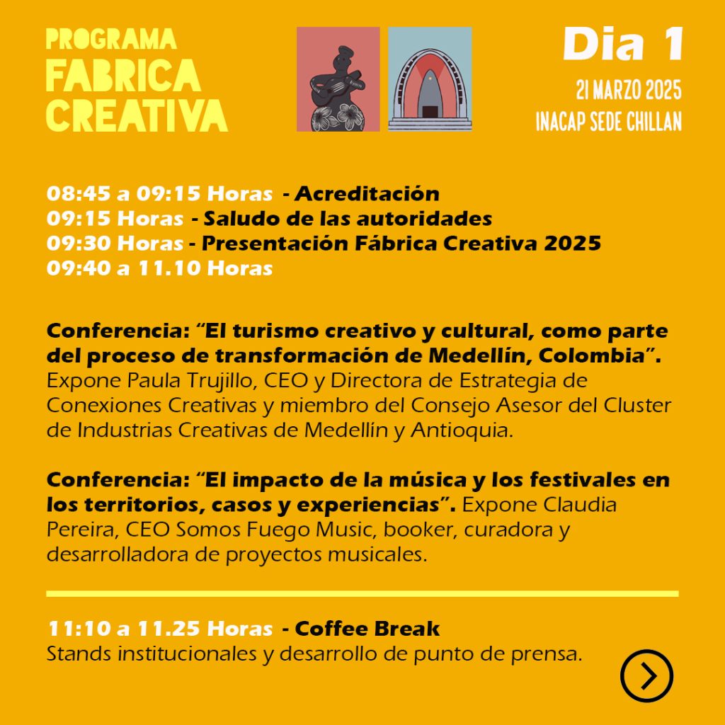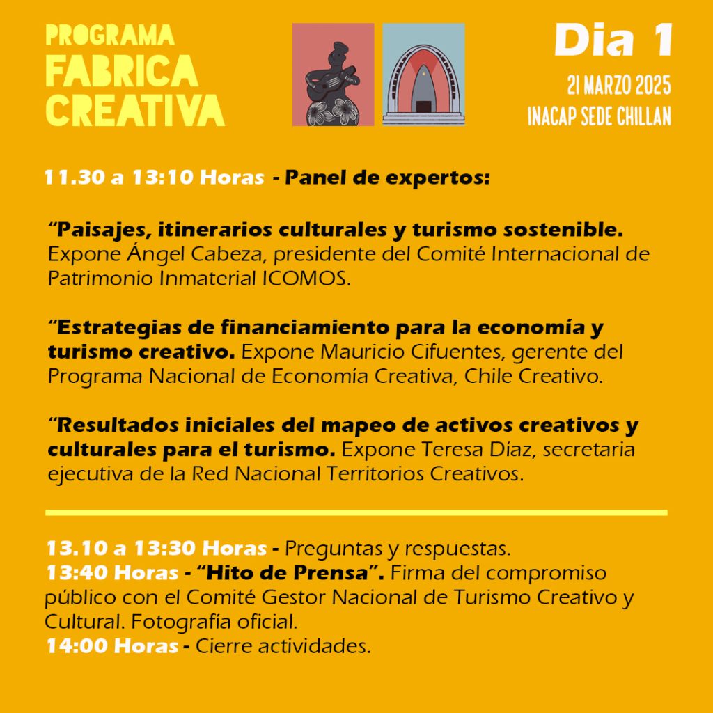 📍 Al finalizar el ciclo de programa surge la Fabrica Creativa 2025, una plataforma de difusión diseñada por el Programa PTI de Industrias Creativas para la música y lo audiovisual donde conocer experiencias internacionales y nacionales de turismo creativo, actividad que desarrollará en Inacap Chillán el día 21 y en Valle Las Trancas el 22 de marzo, con 8 expertos internacionales y nacionales.